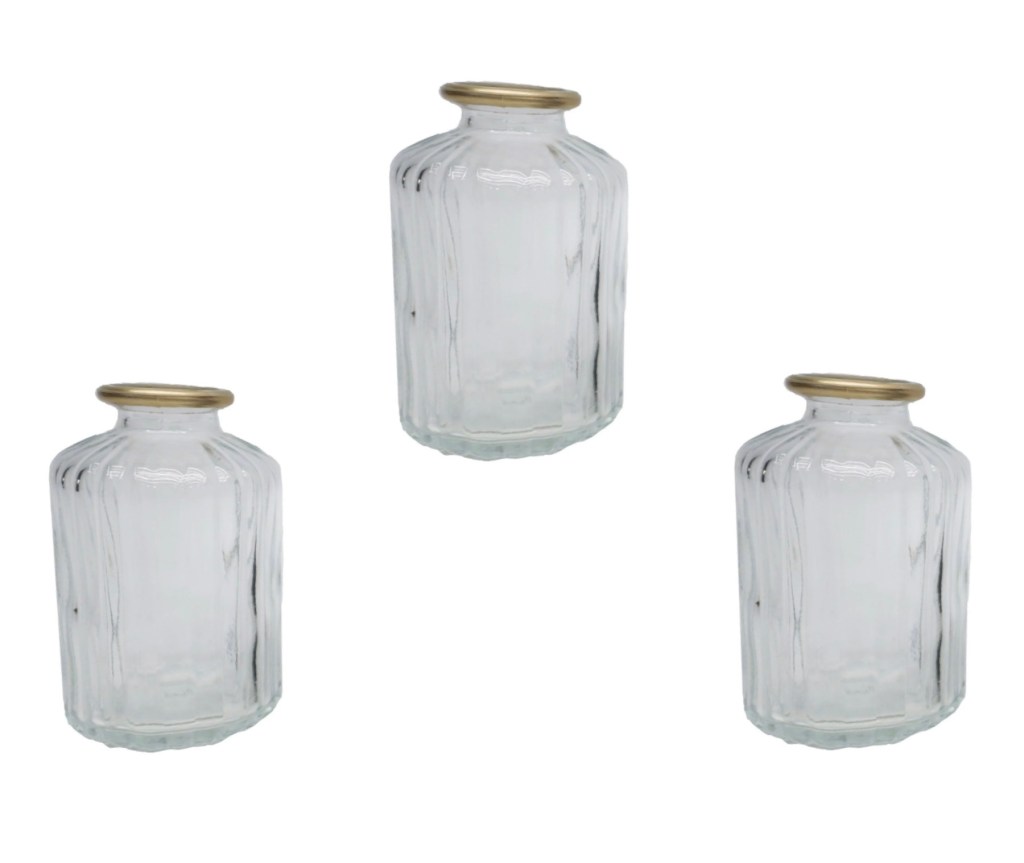 I took three little glass vases out of one of the bags. They were the only three I saw at Dollar Tree one day so I got them, not knowing what I’d use them for, either. I really liked the bit of gold around the top of them.