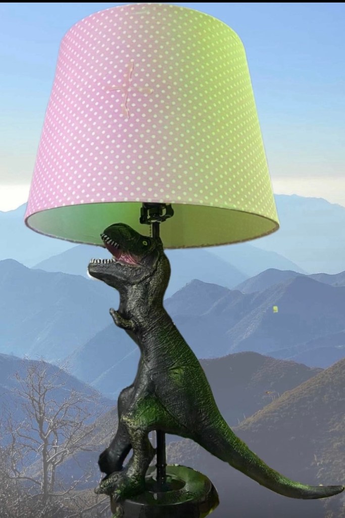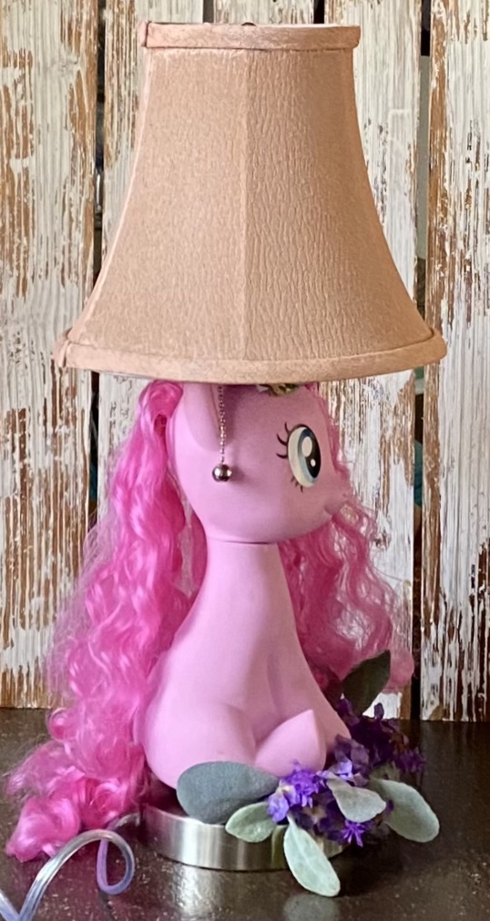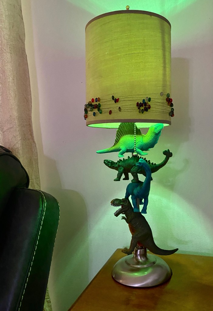 My husband has a background in working with electricity and has been loving scouring Goodwill, thrift stores, estate and garage sales looking for the perfect lamps, and lampshades, dinosaurs and My Little Ponies to create these character lamps.