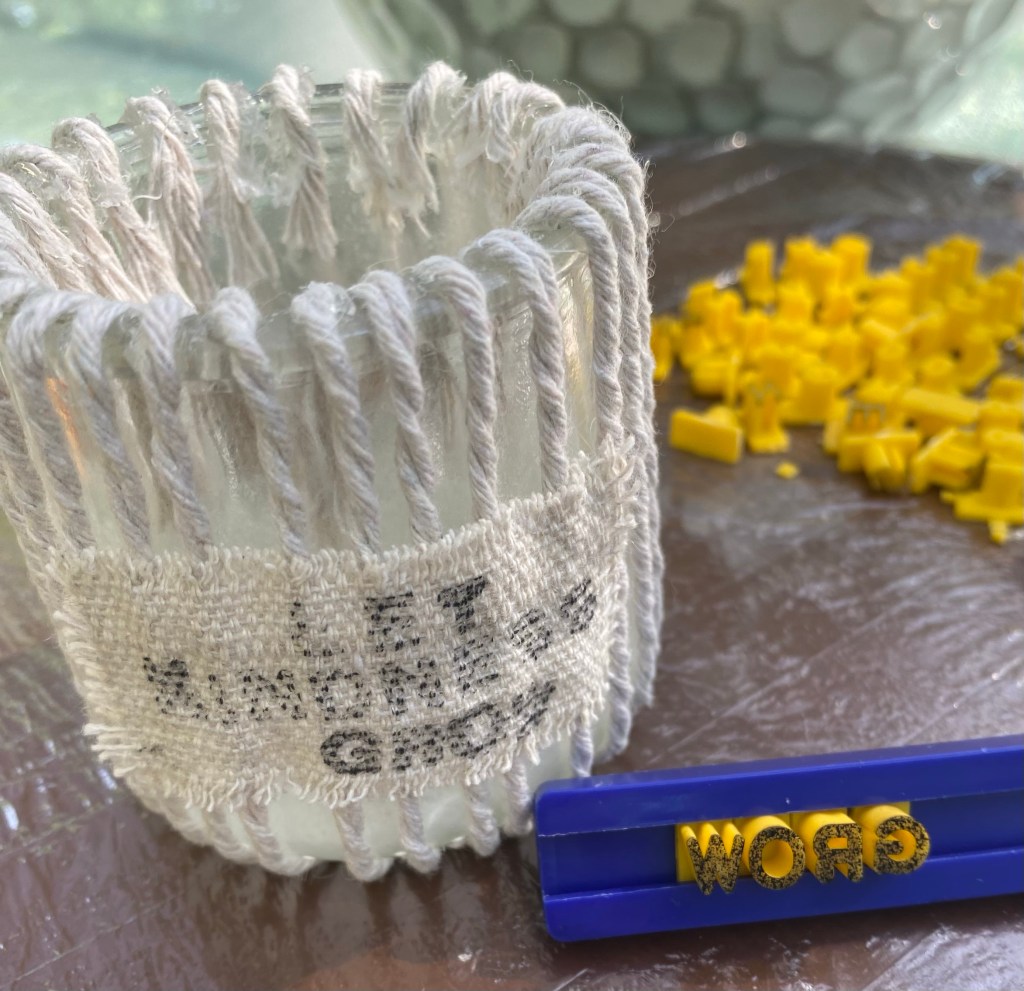 I was now ready to make a label. I cut a piece of dropcloth and frayed the edges then used a number/letter alphabet stamper I bought on Temu and inked the words I made. I then stamped them onto the label. I really like the small stamper as you can do an entire word or words and keep them straight to stamp.