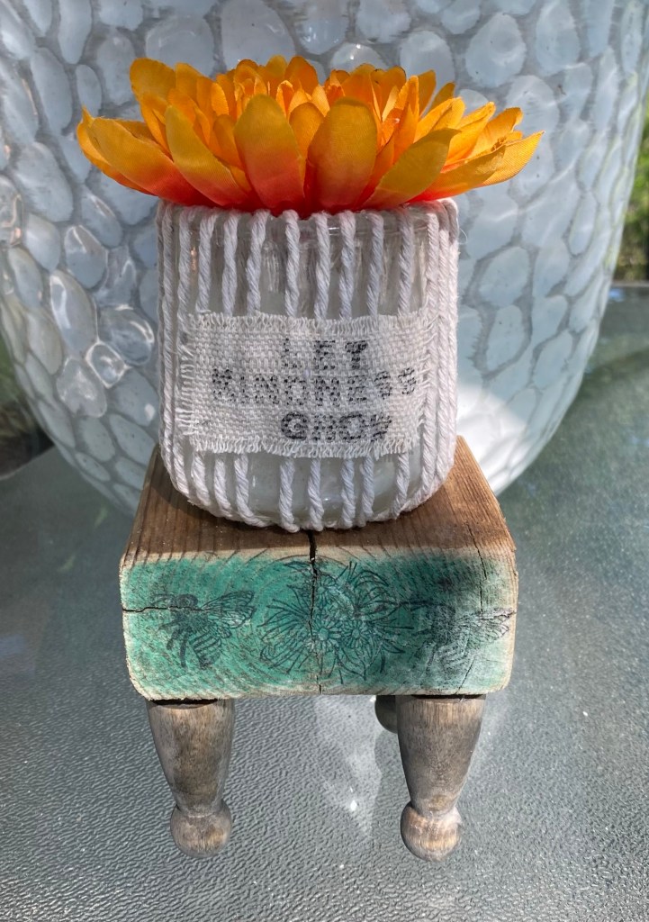 In no time at all I had a beautiful little decorated jar I can use in so many different ways. I just added a faux flower bloom for this one.