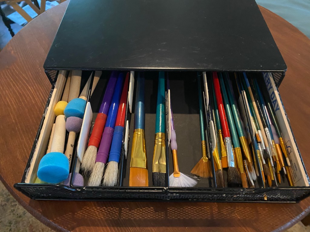 Take this old Kuerig coffee pod drawer my sister gave me. It was sitting on a shelf because I couldn’t figure out what to do with it. Today, I knew! Danny retrofitted it to hold my paint brushes so they wouldn’t fall out the sides. I added flat dominos from Dollar Tree as dividers. I will keep this on my work space and paint pens, scissors, etc. on top in a revolving caddy. Upcycling at its finest!!!