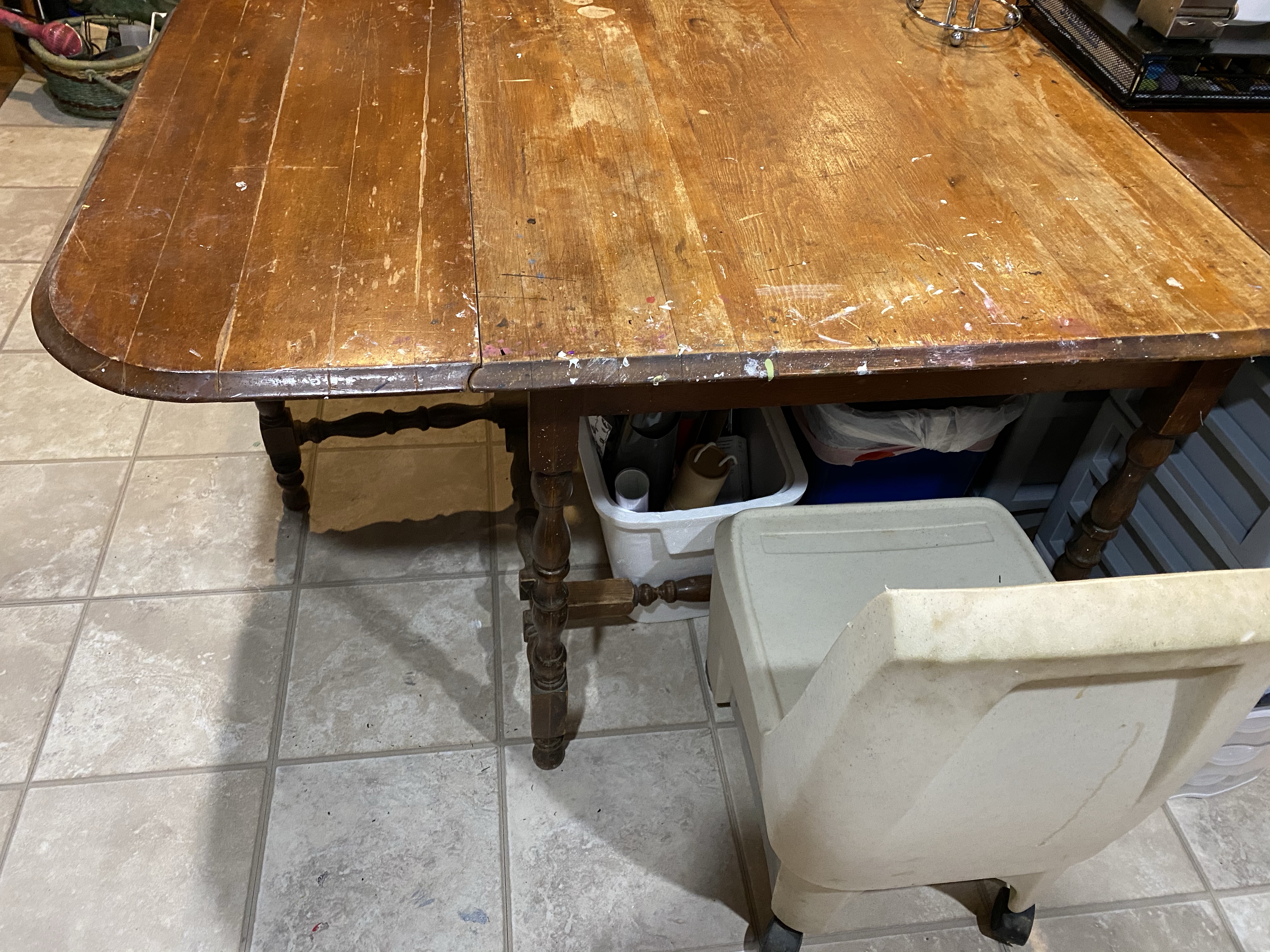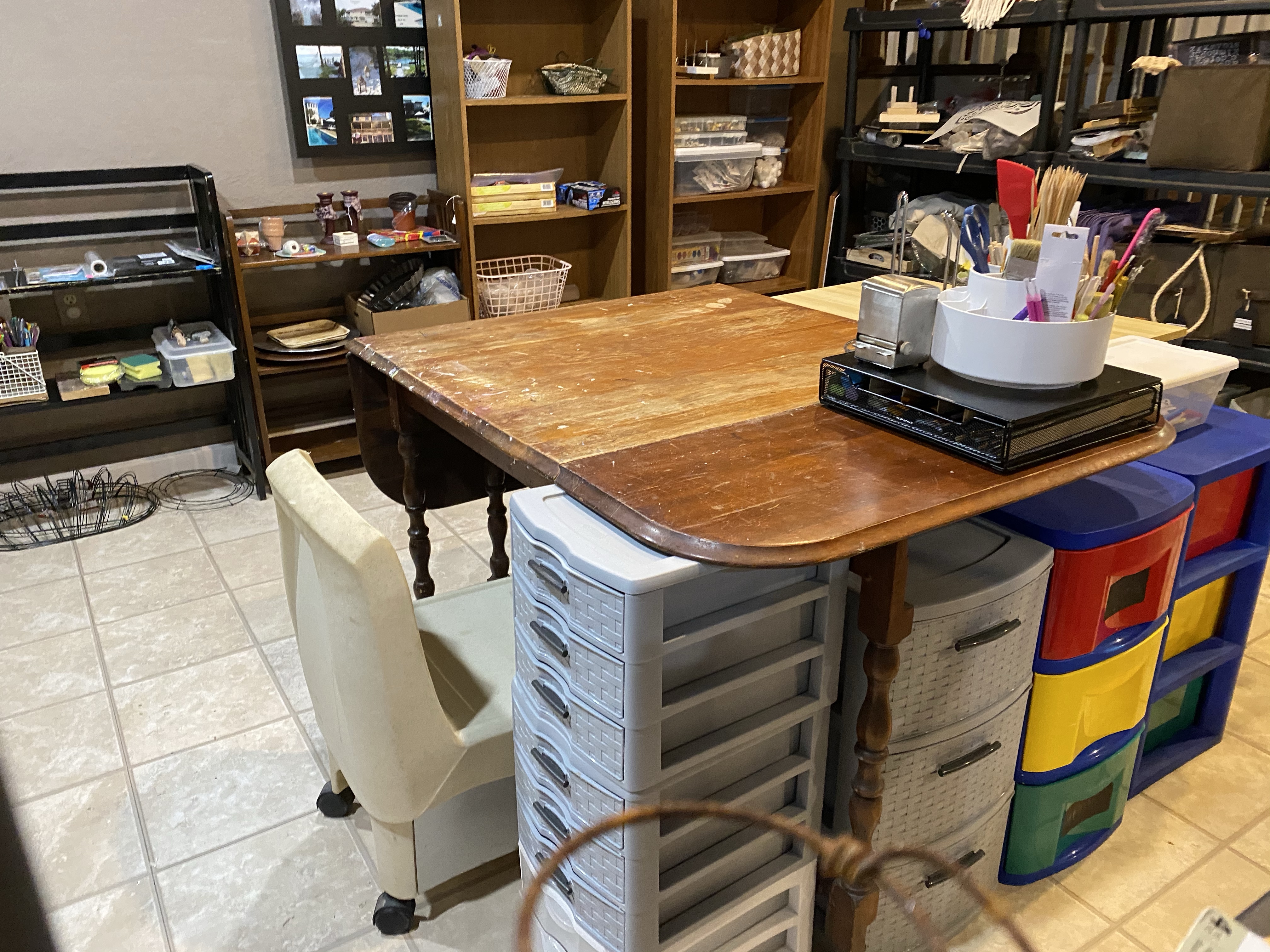 My favorite part of the reorganization is that my work table is now in the center. It is a gate leg table we saved. I love how my storage drawers all fit around the table and I can raise or lower the one side as needed. There is room for the trash can right under where I work. Byron is going to love his art center once again.