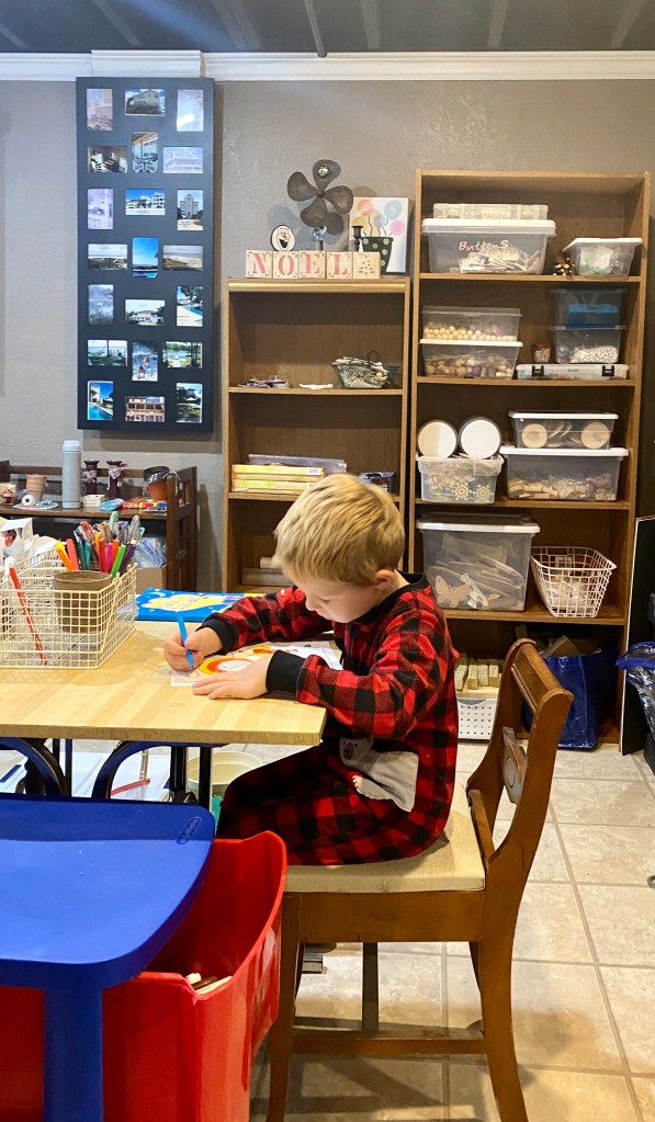 Meanwhile, my assistant Byron is checking to make sure markers are still good by doing a bit of color by number at the art table. Nice that he can read color names now. 🙂