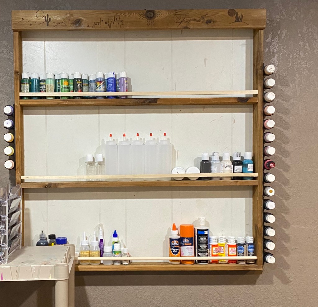 We had already mounted this cool shelf on the wall in the craft area. I haven’t even filled it up yet, but plan to, mostly with sample bottles of our Missouri Limestone Paint Company chalk-style paint. These will be so handy! I can see at a glance what color I want to use. But I also have some bottles of acrylic given to me and want a place to store as much paint as possible.