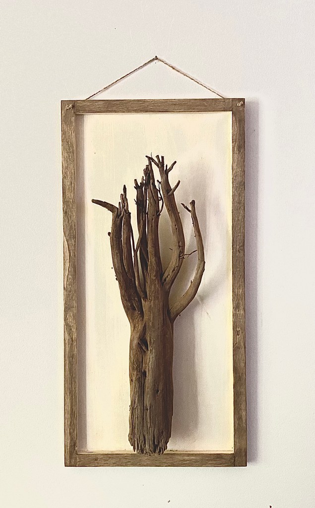 So, we stopped decluttering for a bit. 🙄I just happened to know exactly where a wooden board with a frame was, so I paint stained the frame, gave the driftwood and the board a good drink of Wise Owl Furniture Salve, turned it over to Danny and he mounted the driftwood onto the board with screws and drilled holes in the frame for a hanger. I used jute for the hanger and it was finished.