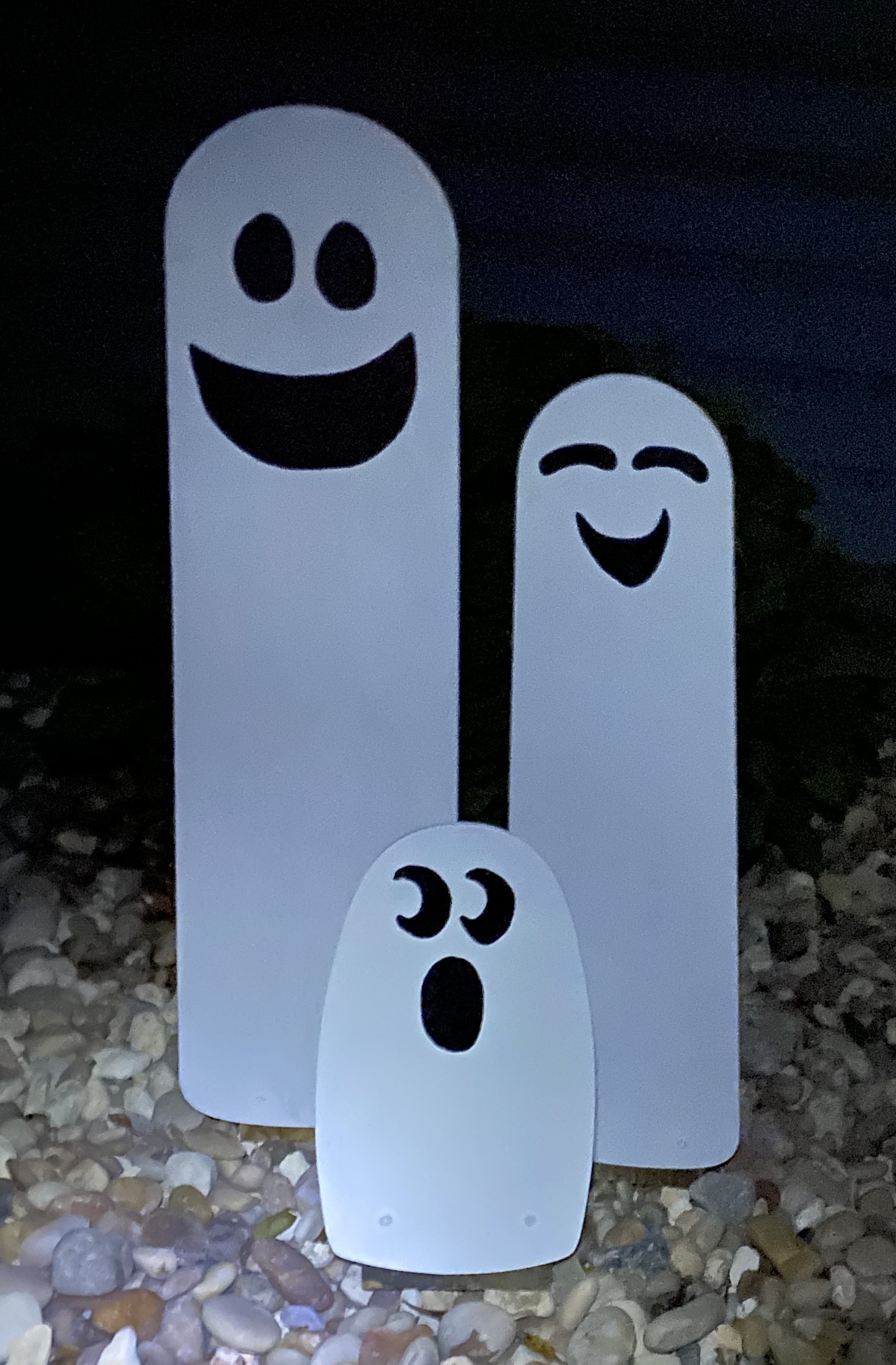 Meet Gus, Gertie, and Georgie, my latest project. They are a happy garden ghost family….not scary at all!