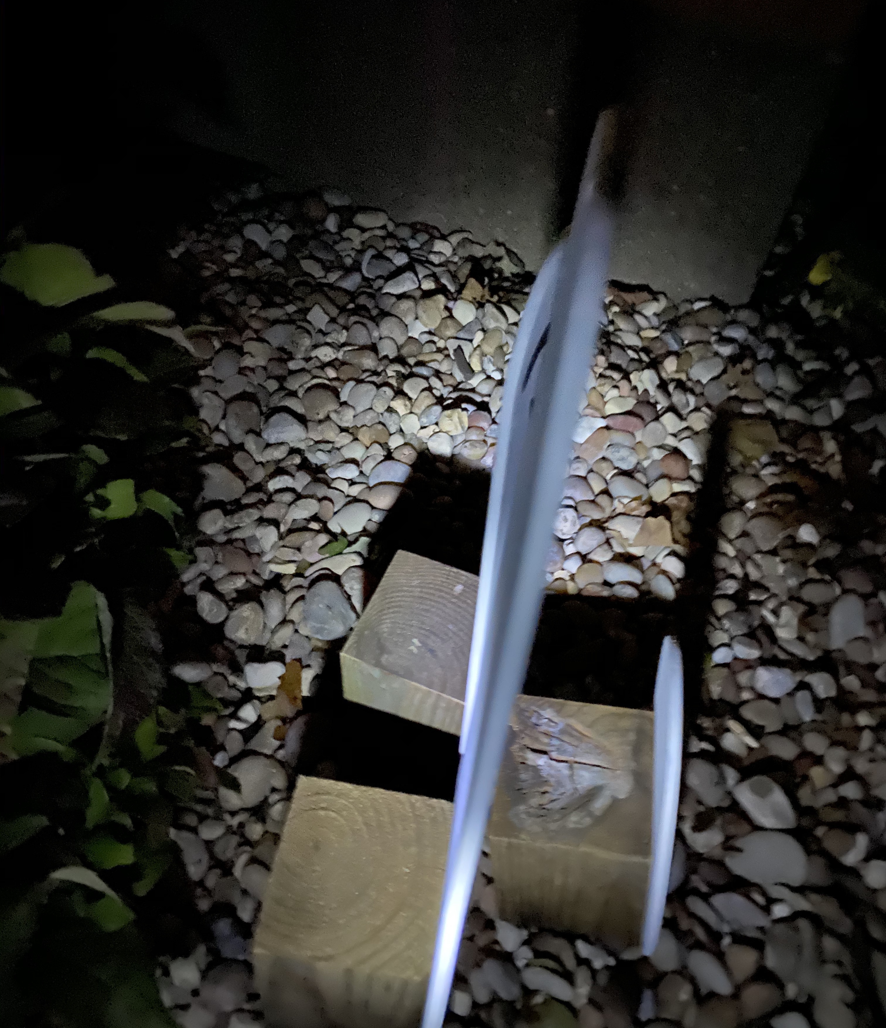 6. I didn’t want them falling over in the garden and getting hurt so Danny found 3 4×4” blocks about 4” tall and screwed them to the wood blocks. These happened to be left over pieces of treated lumber he had stored away in the shed. He left a bit of the treated lumber showing just so the fan blade would be resting on the ground.