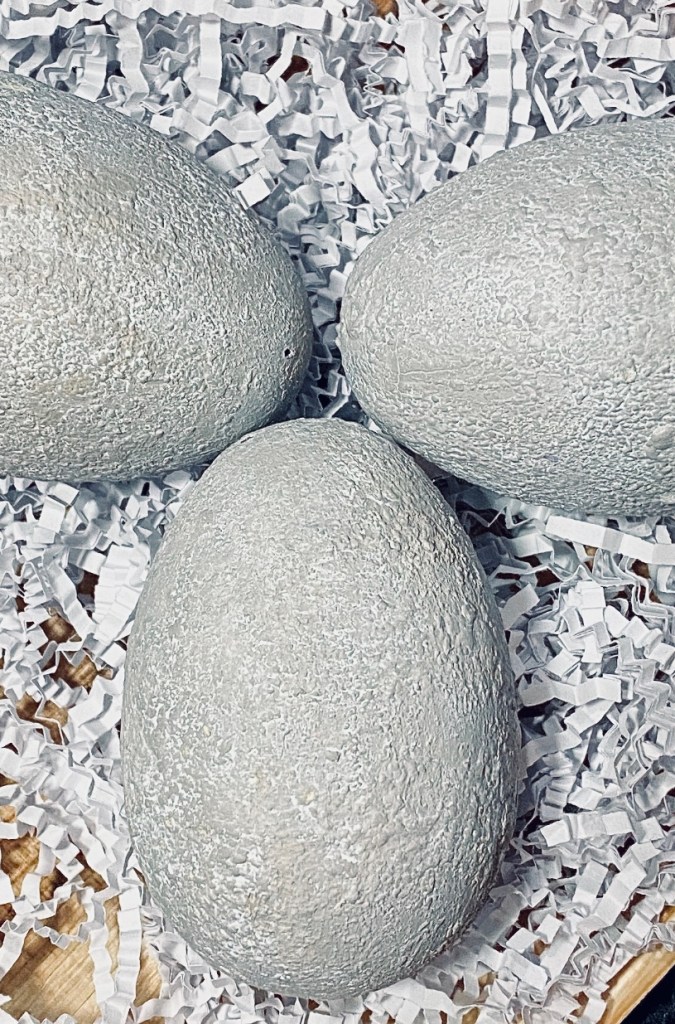 Earlier I painted plastic eggs to make some egg bunnies, but that’s another tutorial. Basically, I glued them shut, scuffed them up, gave them a coat of chalk paint, dabbed more paint along with picking up at the same time with my brush some Howard’s Chalk-tique