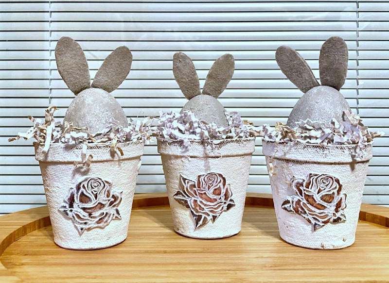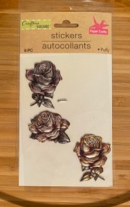 So I painted some peat pots and tried out an idea I’ve had since I bought some plastic puffy stickers at Dollar Tree. My thought was I could glue the rose stickers on, paint over them, then distress them. They had a metallic finish on them and so I was hoping the metallic finish would come through, and Oh….yes it did!!! I found these at Dollar Tree. I also found keys and butterflies and now can’t wait to use them, too..