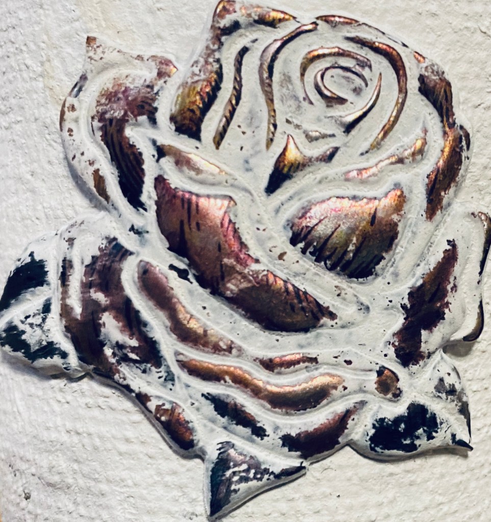 Then I took a damp towel and rubbed away the paint on the raised part of the roses…..and there was the metallic finish coming to life right before my eyes. To really enhance it I rubbed a bit of clear wax over it and Wow! As you can see in the photo above, my idea worked! I’m so happy!