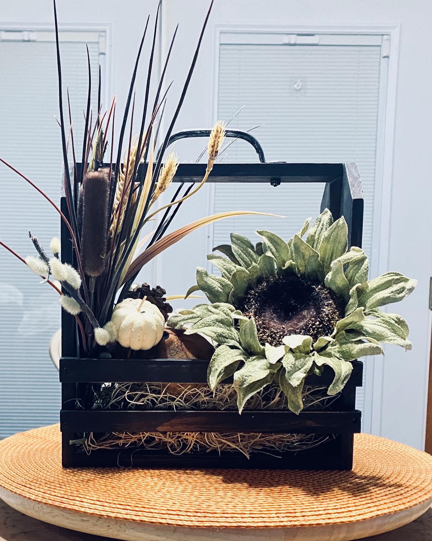 I thrifted this wood container and did a black distress over it using our Missouri Limestone Paint Company chalk-style paint in Coal Shovel. I added some filler, fall foliage, a pinecone, a couple of pumpkins, a gourd, and this beautiful green silk sunflower to create a unique fall centerpiece that looks finished from front and back.