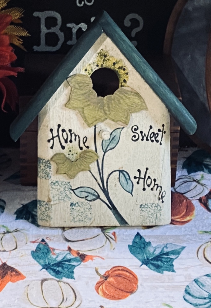 I also decoupaged a little 3 1/4” square natural wood trinket box. I made the little leaf ladder tall last year. It goes perfectly with this arrangement.