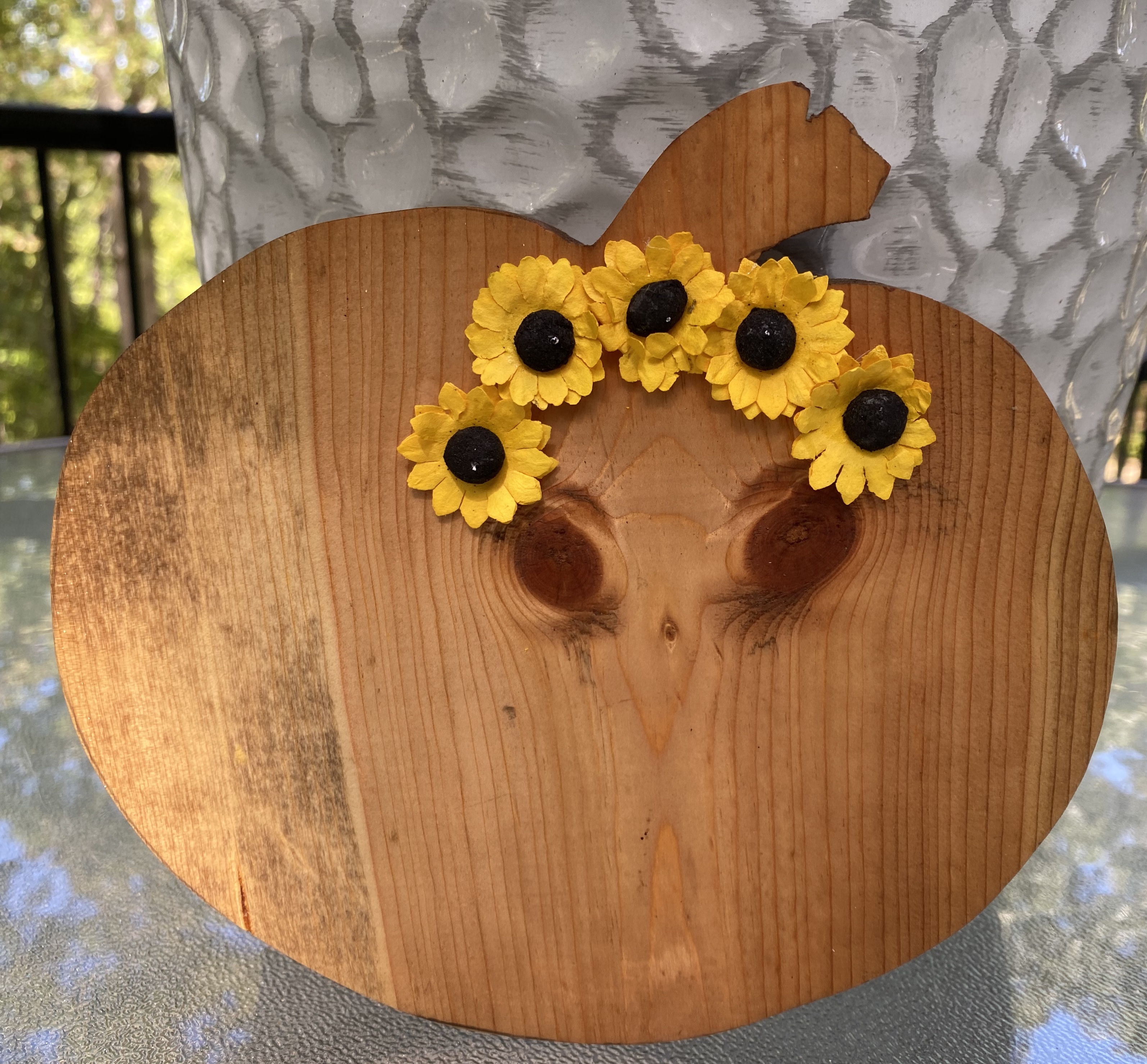 Then my friend, Midge, had an idea: flowers, a tiara, or crown for Woodette. I happened to have some small sunflowers and with just a dab of glue, they will come right off. I can change them out for each season! I think I might need to make Woodette a princess for Halloween and find a little crown for her.