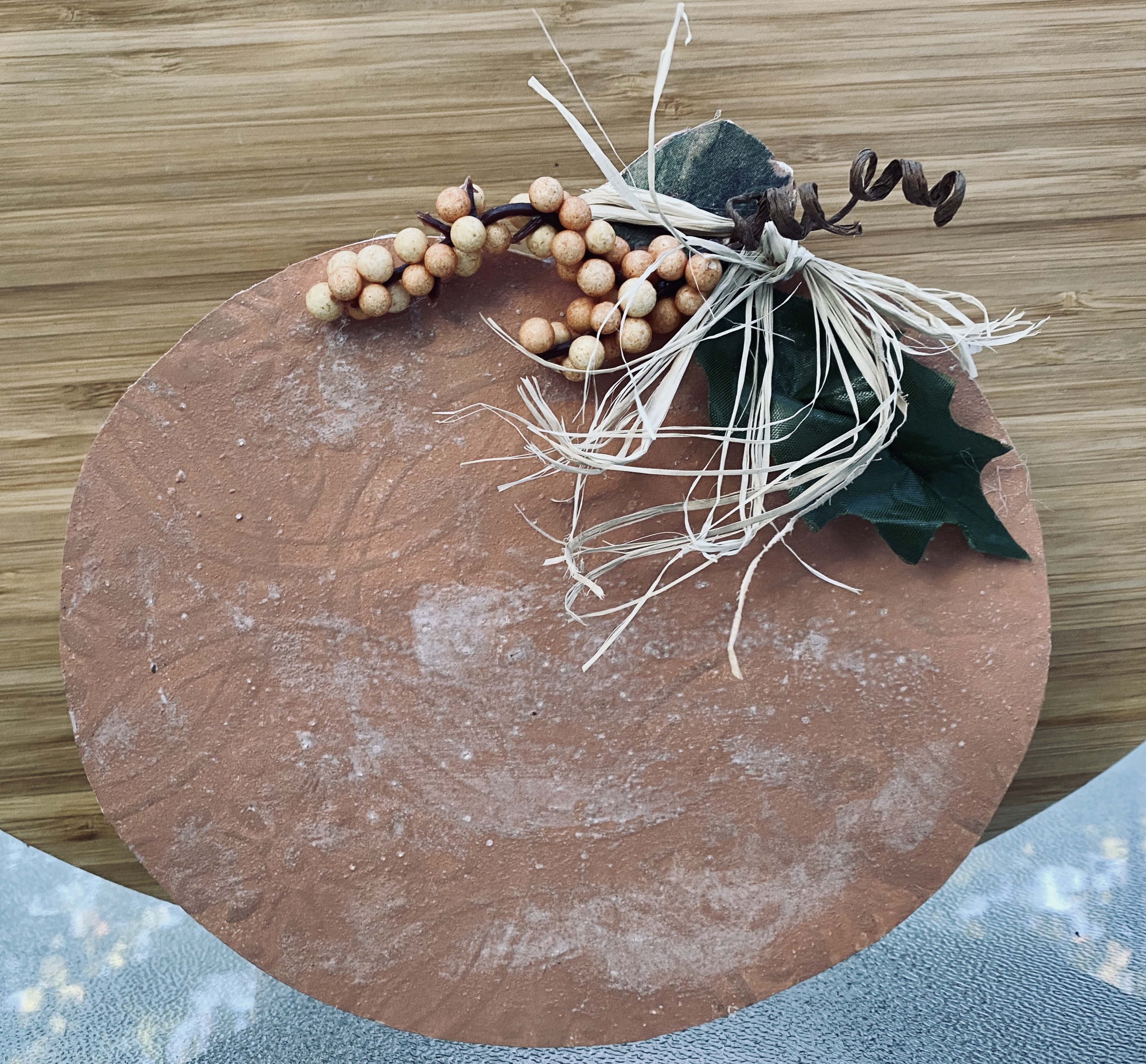 I had this 12” round wooden plate. I had the fall napkins. I had the decoupage medium. I had some little rub on transfers and the wood beads from the foot exerciser I bought a couple of weeks ago at a yard sale to use for feet. I have items to display.