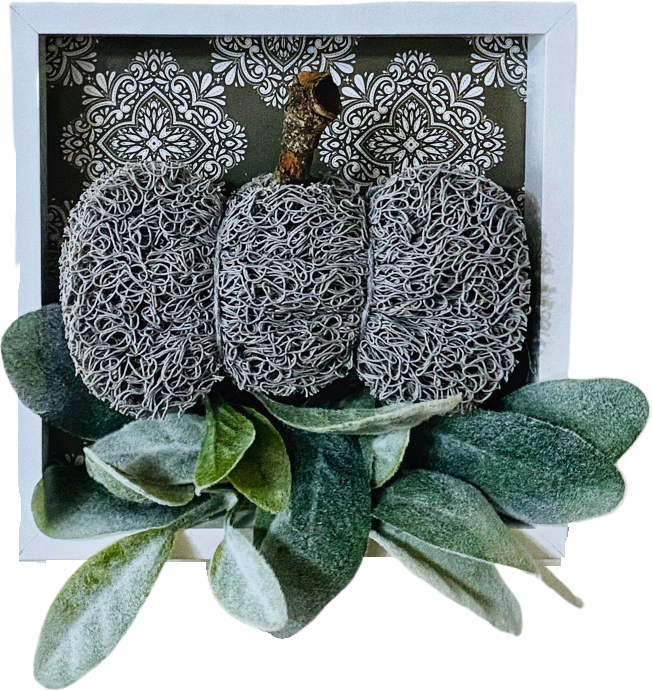 Of course I had to make one, too. This one I left gray and put it inside a Dollar Tree shadow box. It looks so cute with my gray pumpkins I made (the striped fabric came from DT), but I bought a few more to paint! 🙂