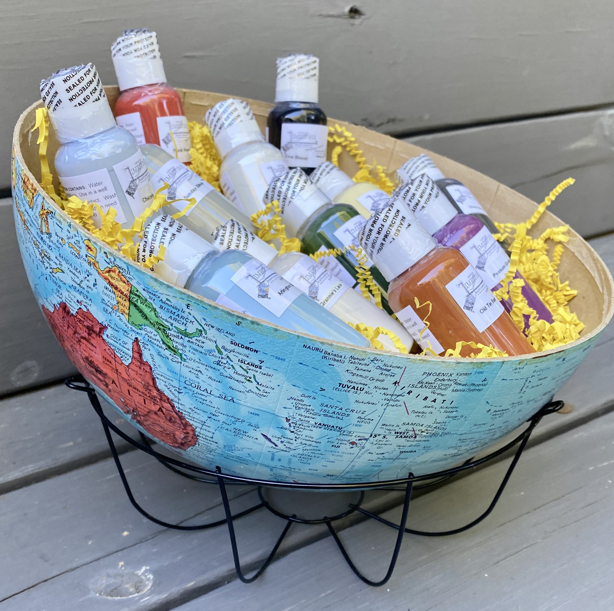 Of course, I made him a display for his paint. I had a half of an old globe. It fit perfectly into a Dollar Tree hanging basket. I added a bunch of shredded paper my sister-in-law gave me. Instant display.