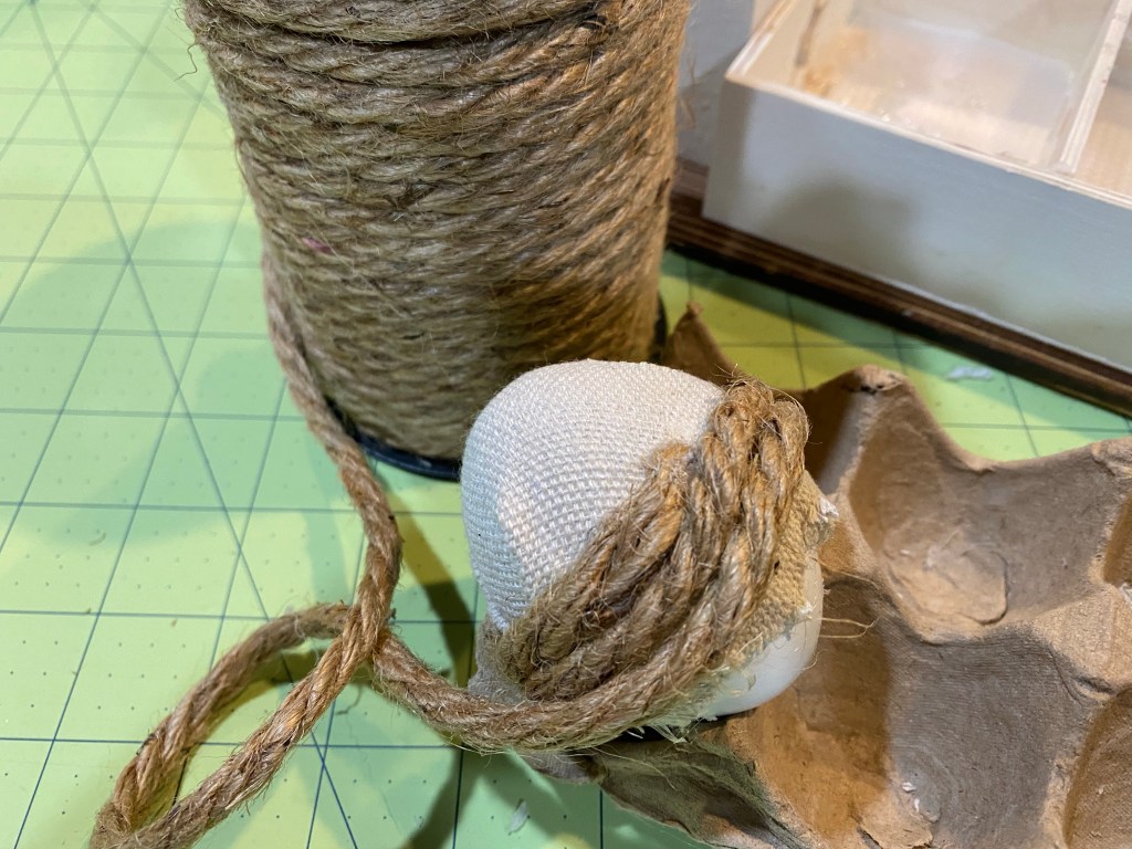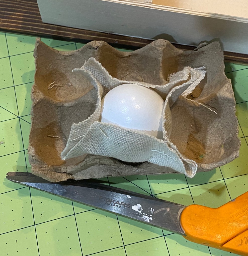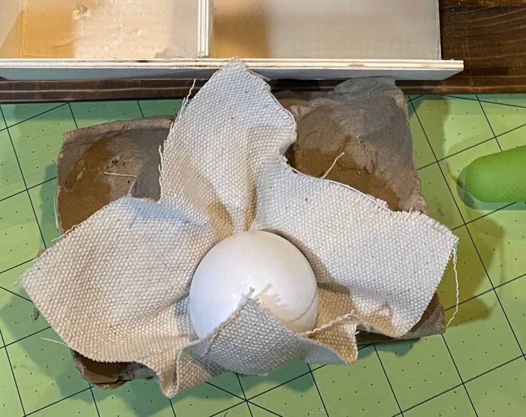 I had a section of an egg carton I used. I laid the drop cloth piece at an angle and placed the egg in the center. That seemed to work well as I applied glue and pressed and smoothed the cloth on all 4 edges.
