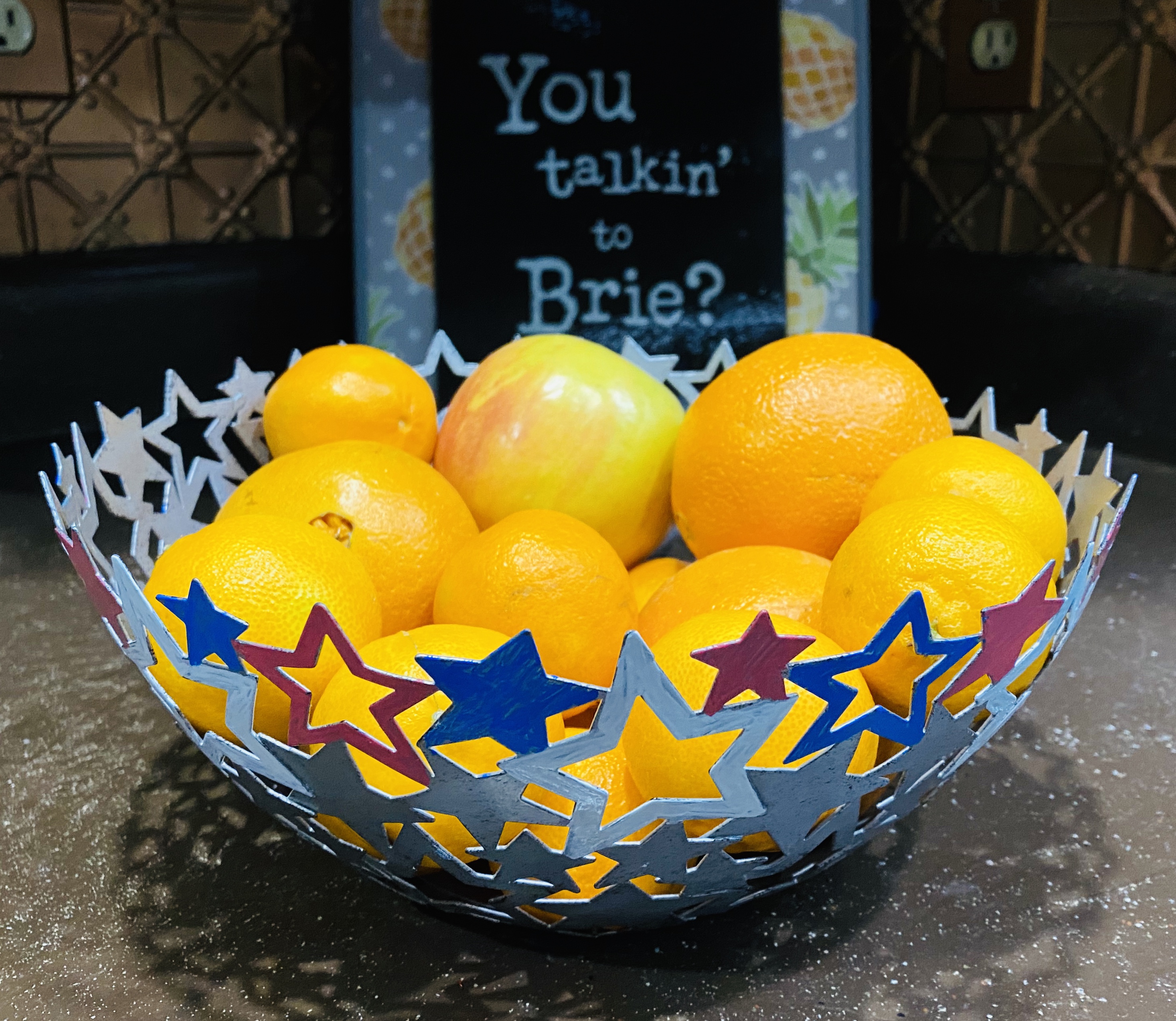 Sometimes just a small change can perk up my kitchen. I thrifted this metal bowl made of stars several years ago with the intention of painting the stars red, white, and blue for patriotic holidays.