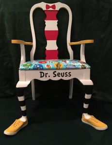 My favorite piece I’ve completed so far is this “Cat in a Hat” chair created out of a vintage captain’s chair. We do have more of these chairs and can create one just for you. They sell for $115.