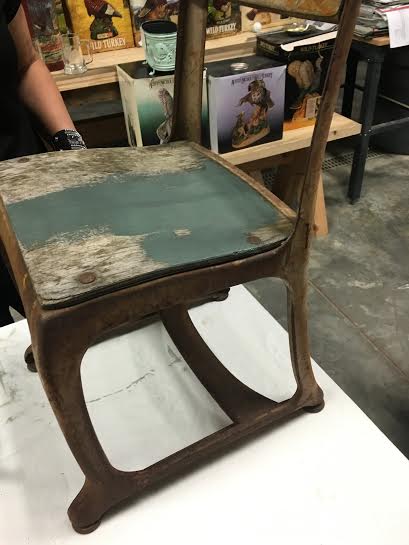 old school desk – remember these? Missouri Limestone Paint Company “Cupboard Green” on the seat blends well with the rusty legs. A “Cupboard Green” wash on the back brings out the carvings. : )