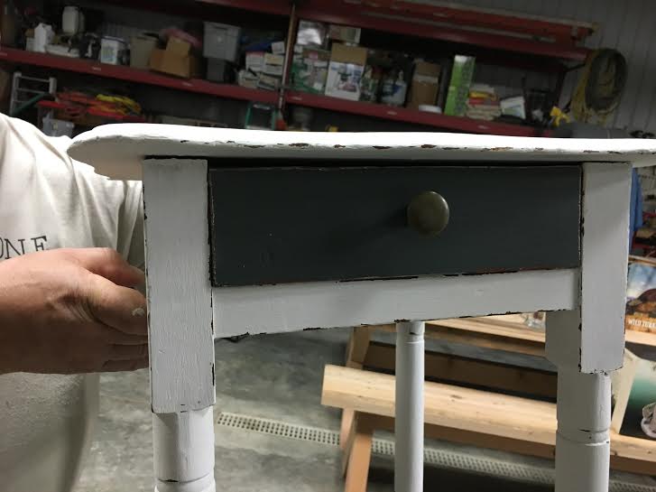 Next, I used Grannie’s Lace and dry-brushed over the French Roast.  Then, just a little of the Sunday Silver dry-brushed, and even less of French Roast again.  I then did a light wash of Grannie’s Lace.  I took dry paper towel and just started rubbing that wash in.  Sometimes I rubbed down to the French Roast and sometimes even harder down to the original finish.  The picture below shows the dry brushing.  UPDATE:  I did another table top after this (see pics at bottom of post).  I didn’t bother using the paper towel and rubbing it in.  Instead, I did a dry brush technique on the other colors (adding just a bit of water – not much) and tried to keep the brushing as straight as possible.)  It turned out as nice, if not better, with much less work.