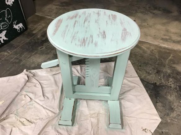 See the ratchet piece under the top. This table adjusts in height. Very clever. Painted with Missouri Limestone Paint Company “Clothesline” and then distressed, it is beautiful!