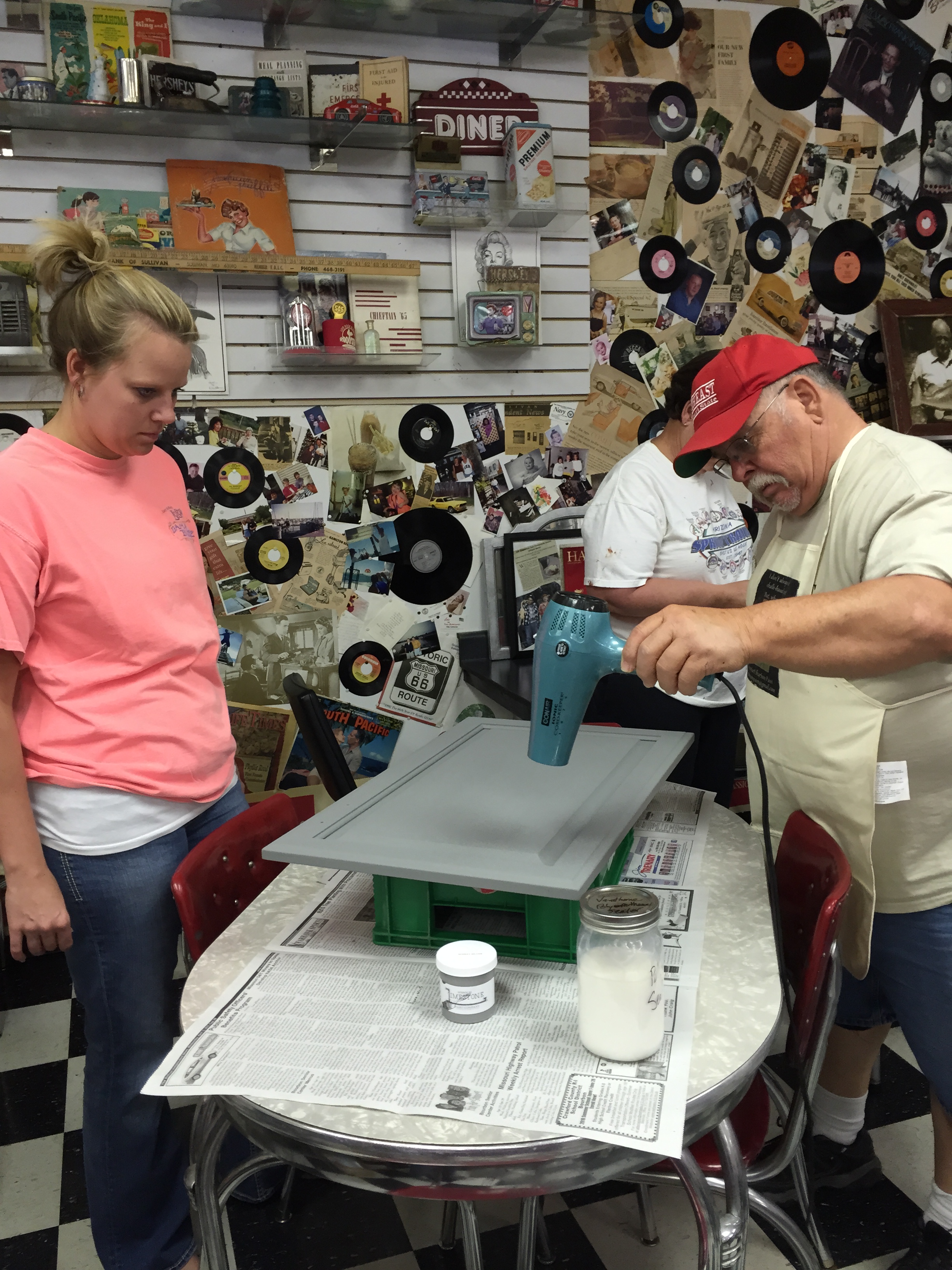 Danny is drying Mallory’s practice cabinet door so she can see how the Varathane polyurethane works and will look. She’s now going to paint her kitchen cabinets.