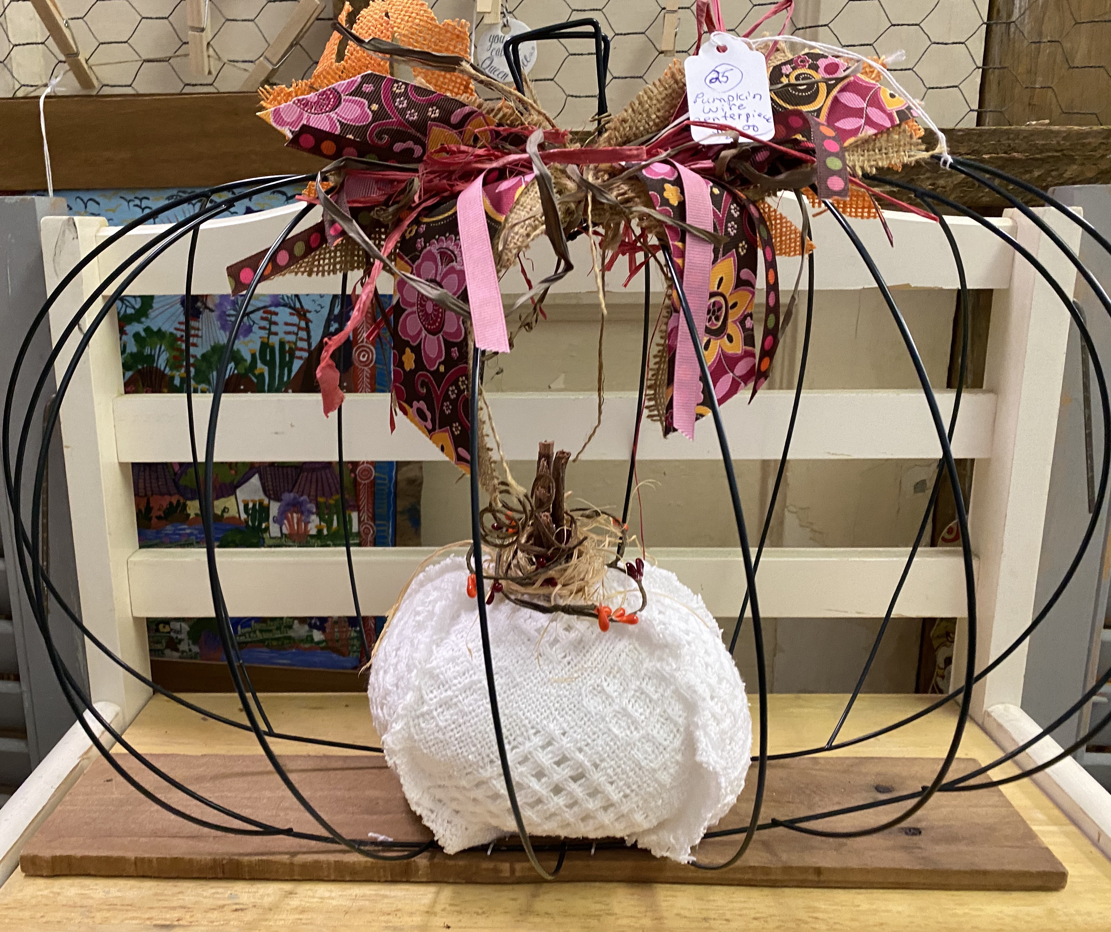 This pumpkin was inspired by Julie’s Signs & Designs. I made a template kind of in the shape of a tear drop and cut 8 pieces from a vintage chenille bedspread. I hot glued them together so the edges were on the outside.