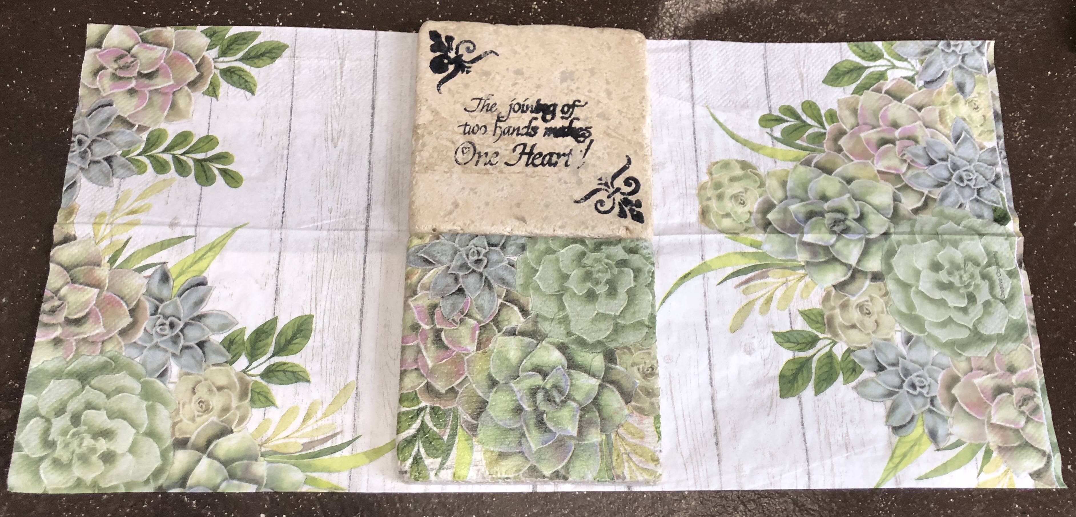 Step 1. You must remove all the extra layers of the napkin. This one happened to have 2 extra layers. You only use the layer with the image. I cut around the image part of the napkin: I cut around all the succulents and greenery of the napkin and then took the other end of the napkin and cut it into small pieces.