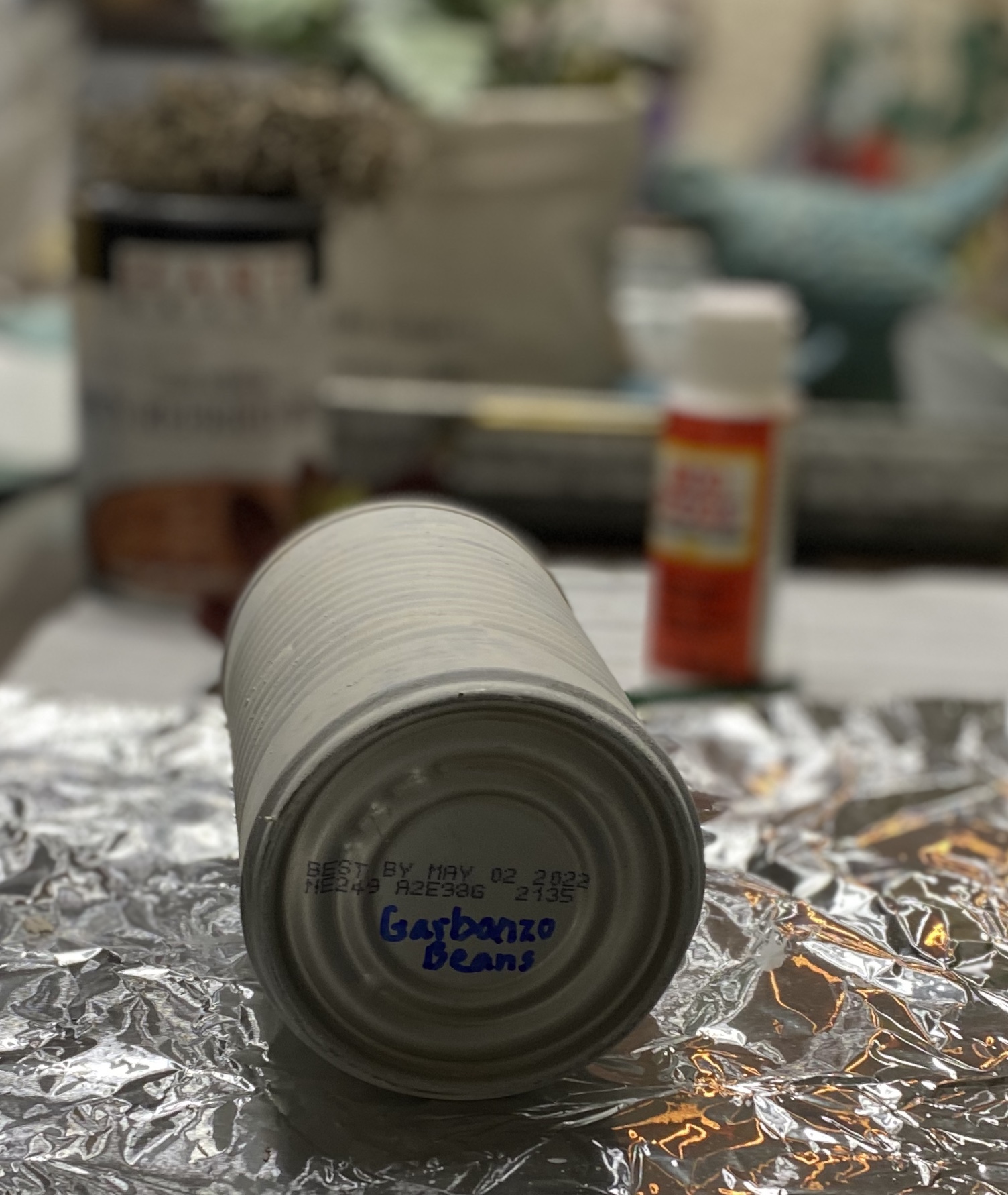 I woke up this morning thinking I wanted to napkin decoupage a tin can and add a succulent to it. I had all the supplies except for the tin can. I did have a can of garbanzo beans, though. I didn’t want to waste food, so I decided to just decoupage the full can. I could always just open up the can later. I did realize, too late, that I shouldn’t paint the lid in case I do want to eat the beans. So I would not paint the lid the next time.
