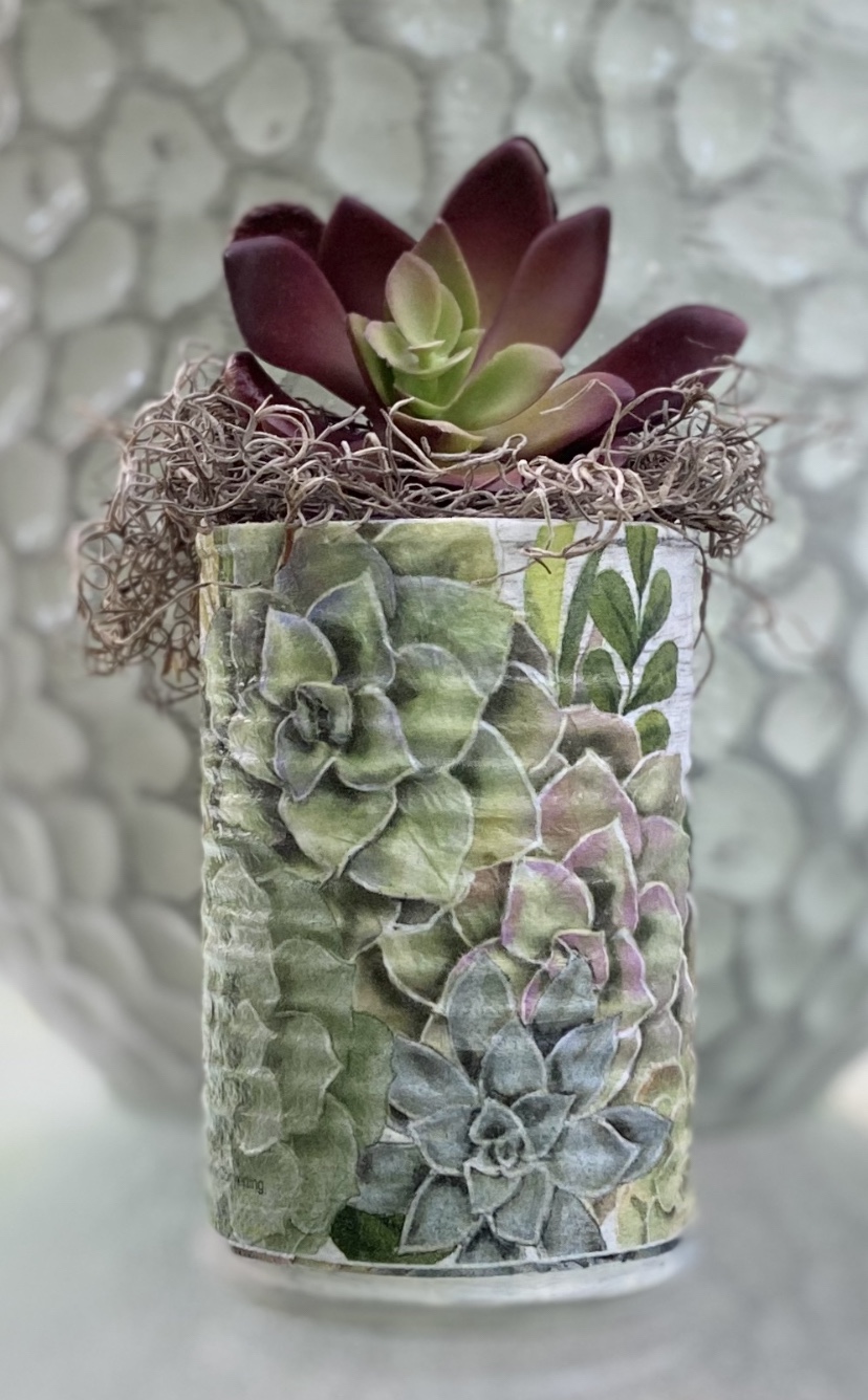 Step 6: Final Step. I just added a little Spanish Moss and a Faux Succulent to the top. You could use a spot of hot glue to hold it in place, but I didn’t. After all, I may just want to open up that can of garbanzo beans. The moss and succulent will be easy to remove. ☺️