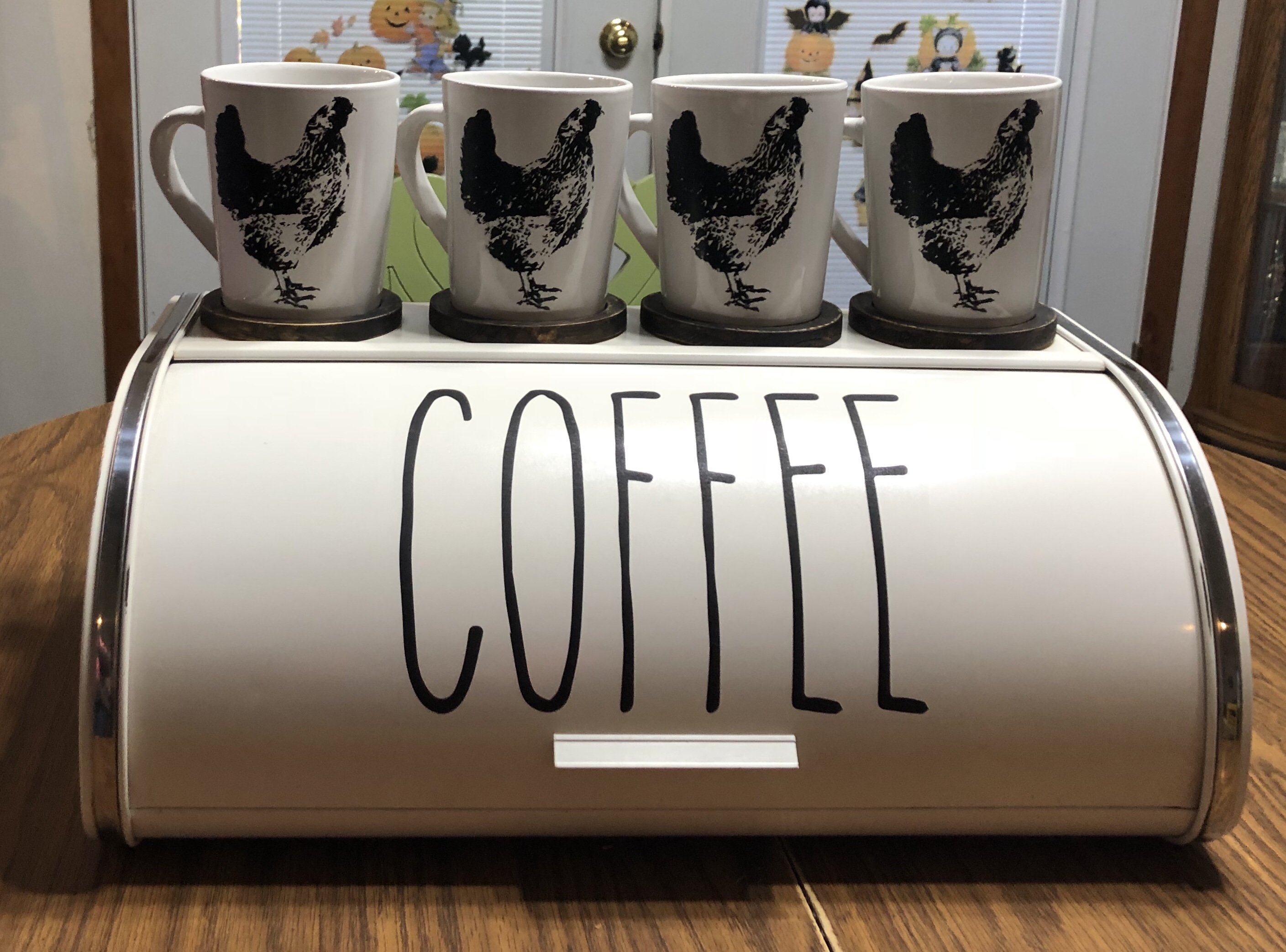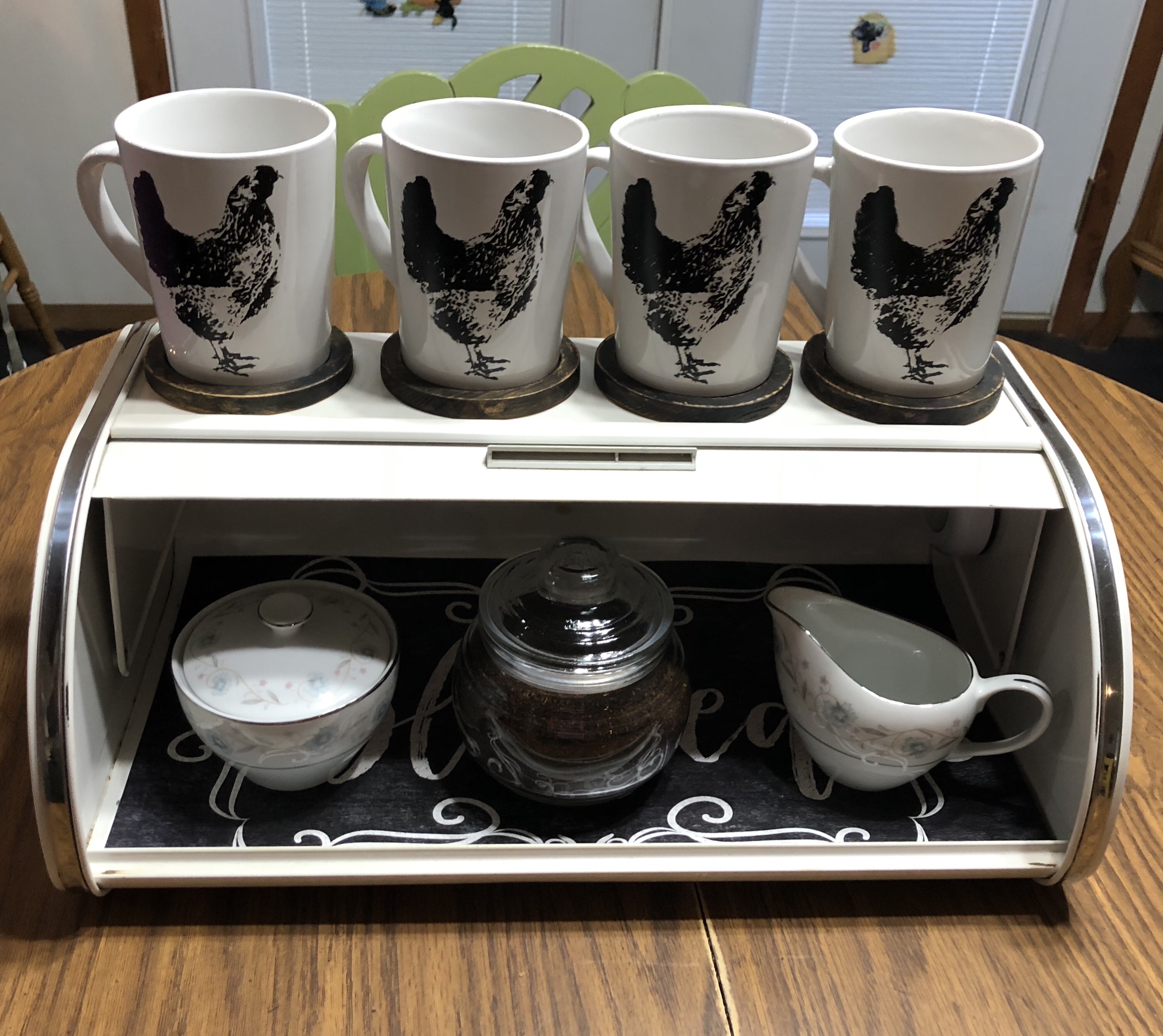 But, what’s a coffee bar without the fixings? I included an apothecary jar of ground coffee and a 46 year old vintage sugar and creamer set. How do I know it is 46 years old, you ask? I know because it is what is left from my wedding china and today, October 28, is our 46th anniversary! I sold the rest several years ago. Some people register for their china. In my family, I shopped at Kroger for weeks for my mother so I could collect this china during one of their promotions. 🤷🏼♀️