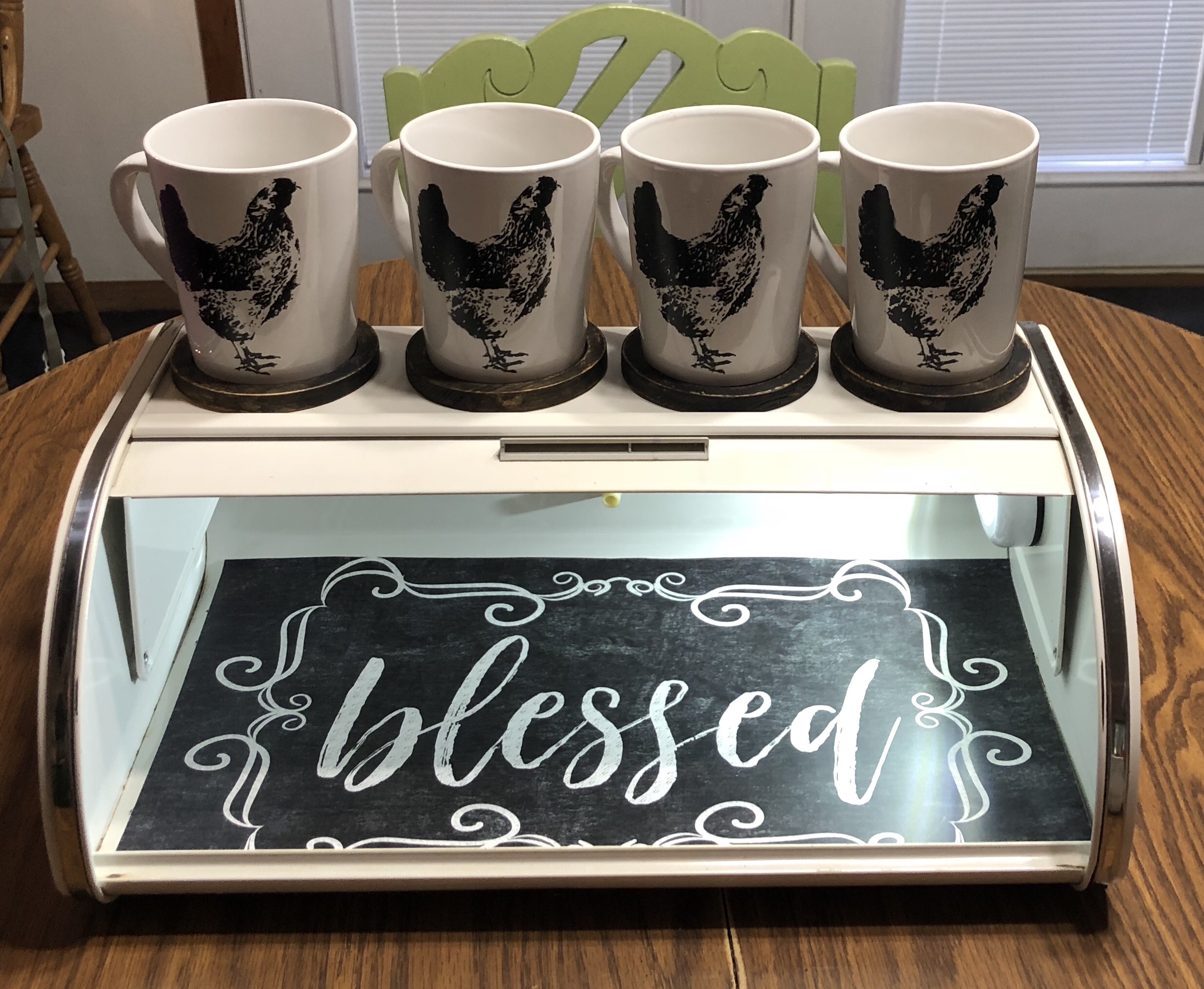 The top was the perfect size to hold the four mugs. I also just happened to have four round wooden coasters. I painted them (including the cork) with one coat of the chalk-style paint we sell. Missouri Limestone Paint Company I then distressed them with some sandpaper. I did not seal them. They ended up with a great farmhouse look. I forgot to take a picture, though. You can see them under the mugs in the photos.