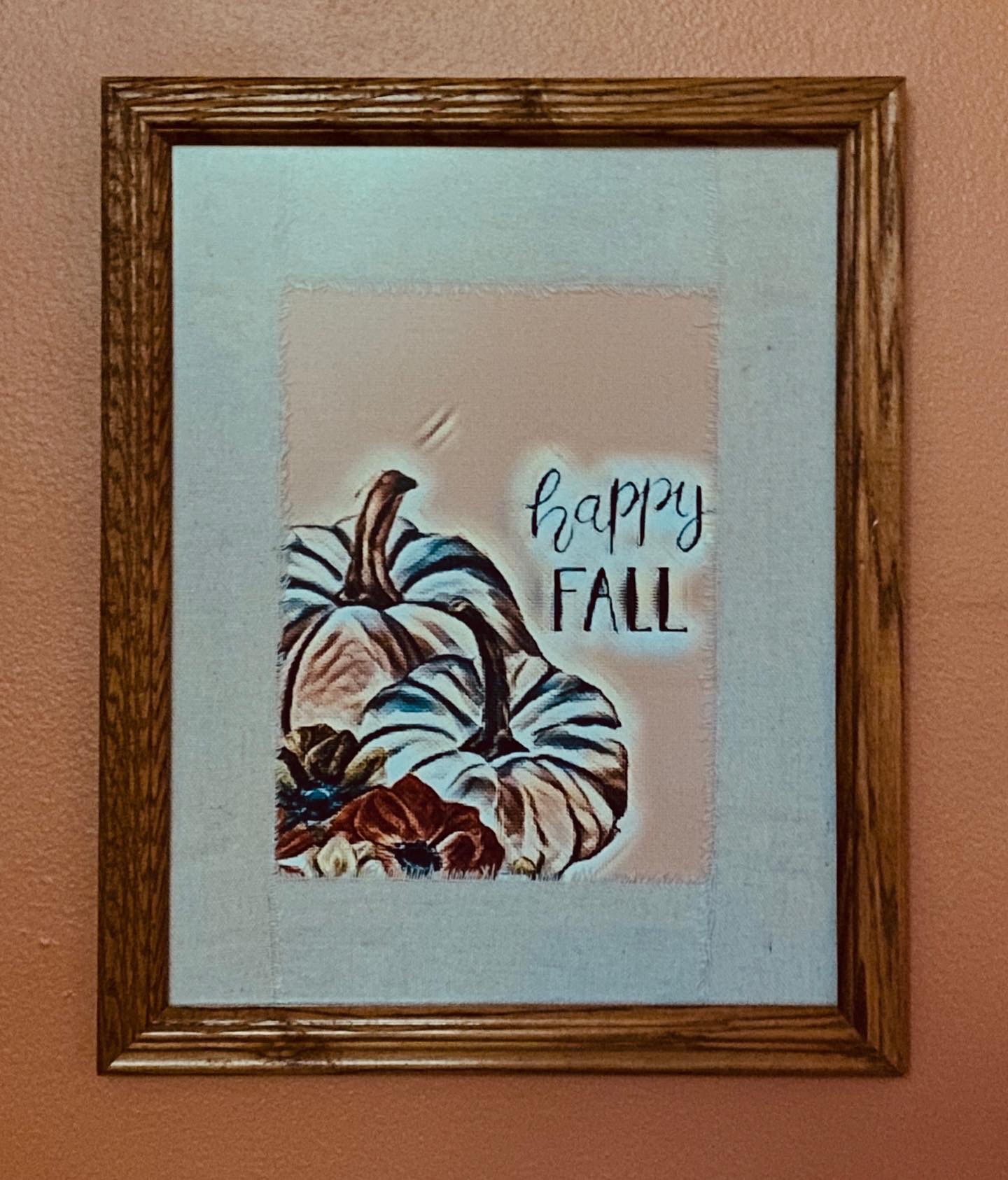 #2 This recycled 12×15” wood photo frame has a new life as a piece of fall decor. The print (61/2” x 10”) has had an artistic flair added along with a textured look. It is printed on card stock and framed with strips of ravelled canvas. The glass is the glare free kind.