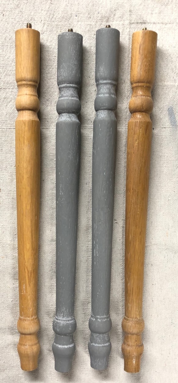 First up, the legs – the tables are well made – solid wood with metal inserts for the legs to screw into. I’m sure there is a furniture term for that but I do not know what that is. Just know the legs easily screw on and off with no worries. We cleaned, hand sanded, then cleaned again and they were ready for paint.