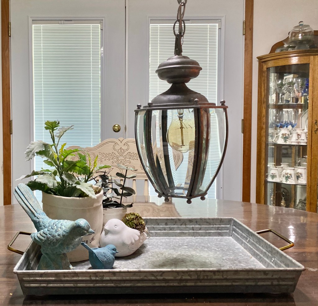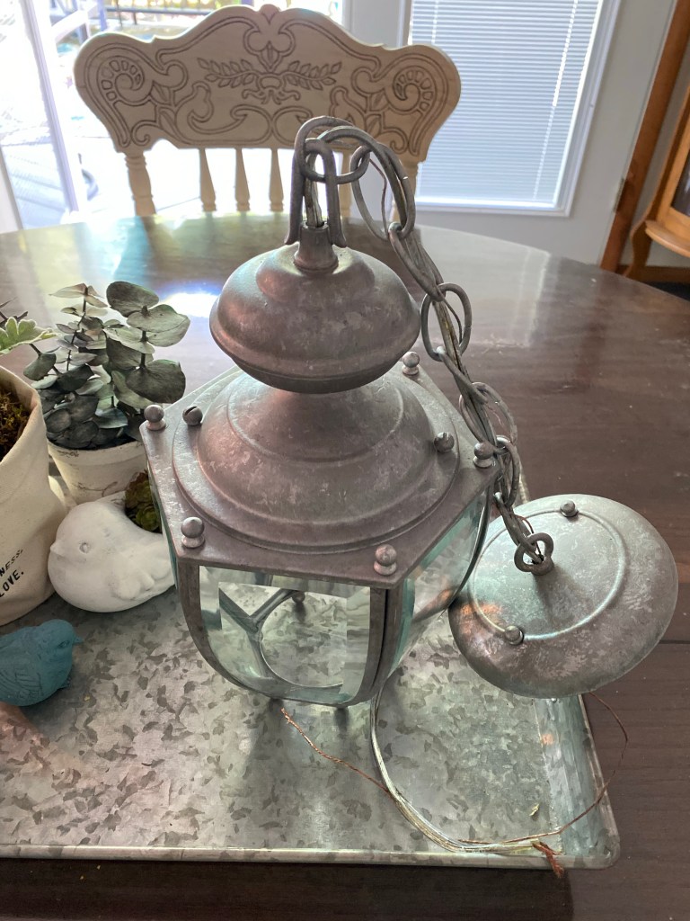 I found a great tutorial for creating faux galvanized tin using paint. I repurposed this brass plated hanging pendant light and it looks like the real thing.