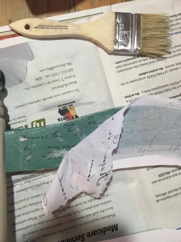 I printed out several reverse copies of the French Handwriting Script from The Graphics Fairy.  I decided how I wanted them to look on the ladder backs, then trimmed them.  I also wet down the edges and tore them so they wouldn’t be straight as mentioned above.  Notice in the photo I tore 3 sides on the first one  That was before I realized the top and bottom wouldn’t show anyway as I wanted it to go off the wood, but the sides would end, so I really only needed to wet and tear the sides of each.