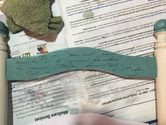 I put the chair on its back to make it easier to work with.  Each ladder back will have a liberal coat of poly painted on.  I did one ladder back at a time, putting on the poly, then adding the image with the script facing down.