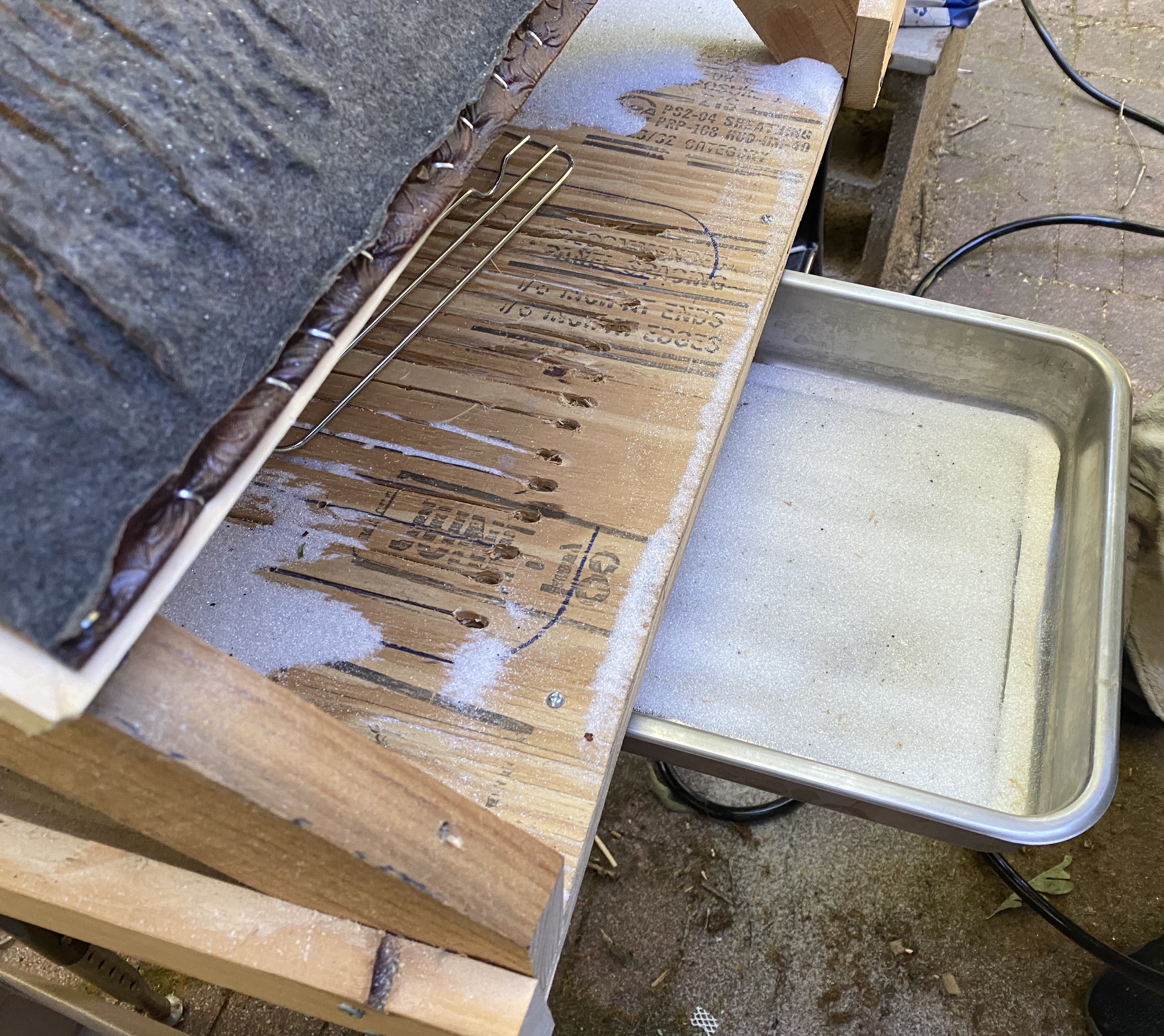 He needs a tarp, though, to catch any that escape. There seems to be quite a bit on the patio, but he did drop the pan that collects extra when showing it to me. Oops.