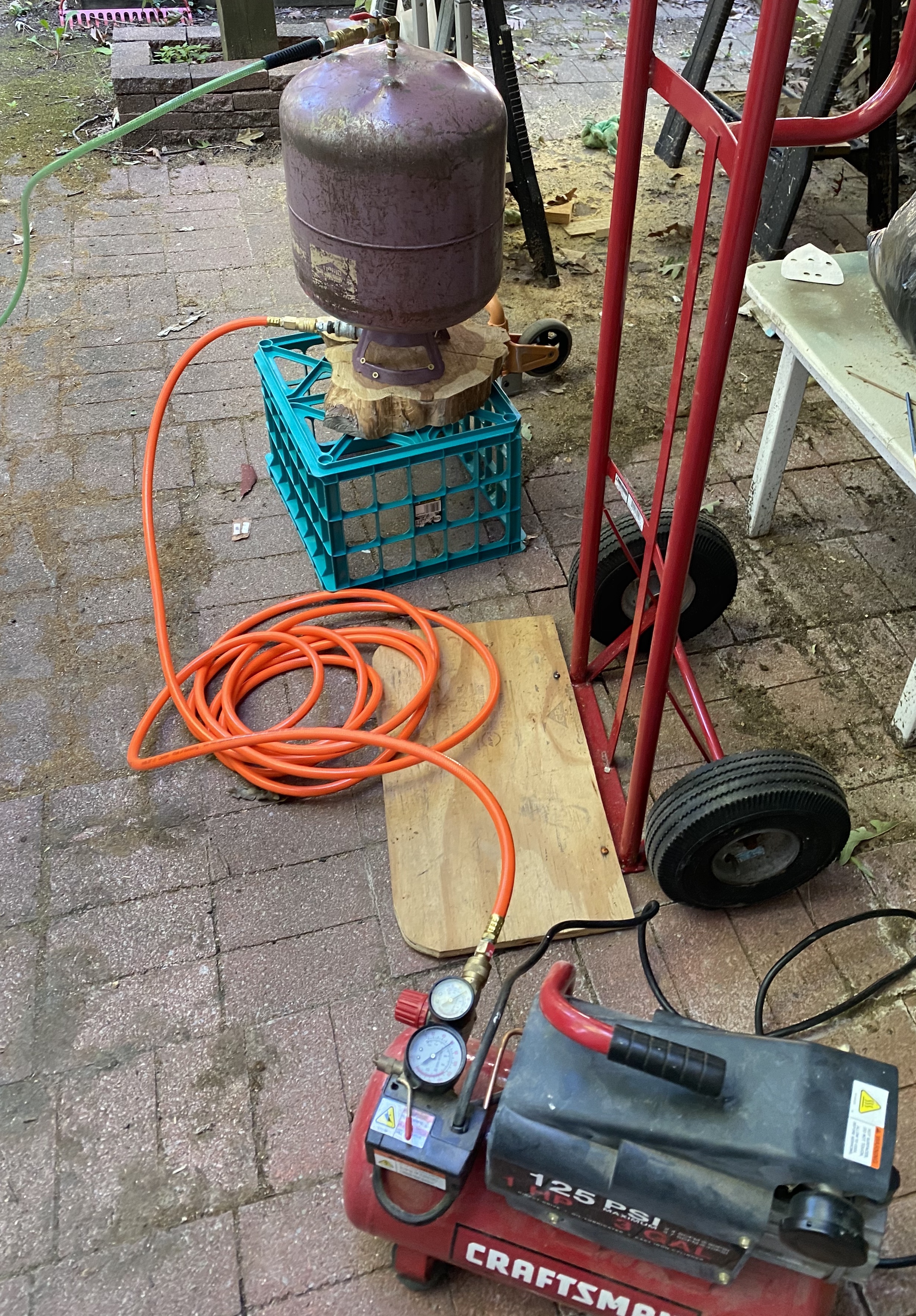 He finally got everything together and is testing it out today. He even found a booster for his air compressor at a yard sale that he wanted. The only thing he didn’t have was ear plugs and a mask for the first test run. He did have safety glasses and leather gloves on. He has them all now.