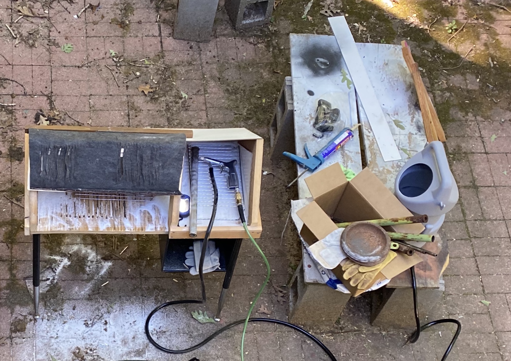 He found a little desk he thought would be the perfect stand. He removed the top (I’m sure we will see it again somewhere) and built this little contraption to keep the glass beads contained and caught, as they are reusable, while he blasts a piece of the lamp with glass beads. He found the beads on Amazon.